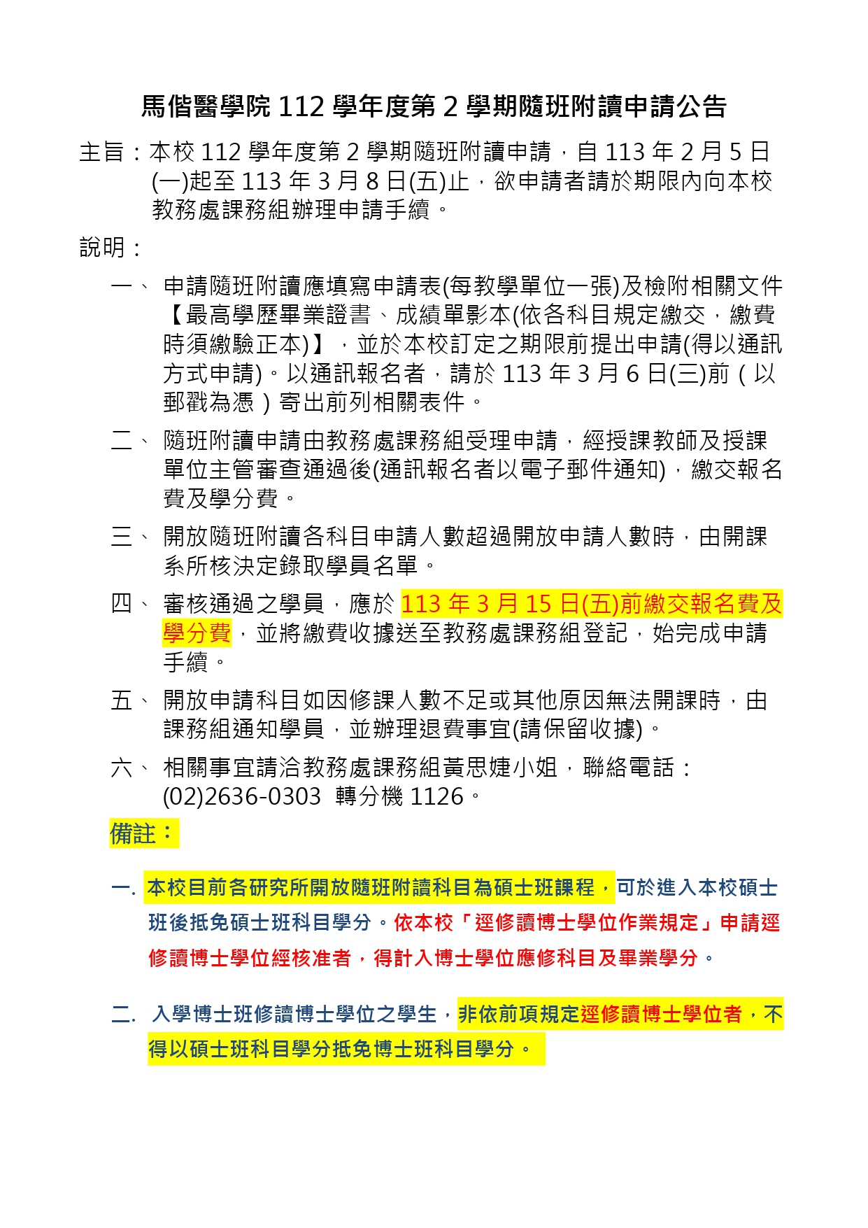 [2024/01/31] 112學年度第2學期隨班附讀申請公告